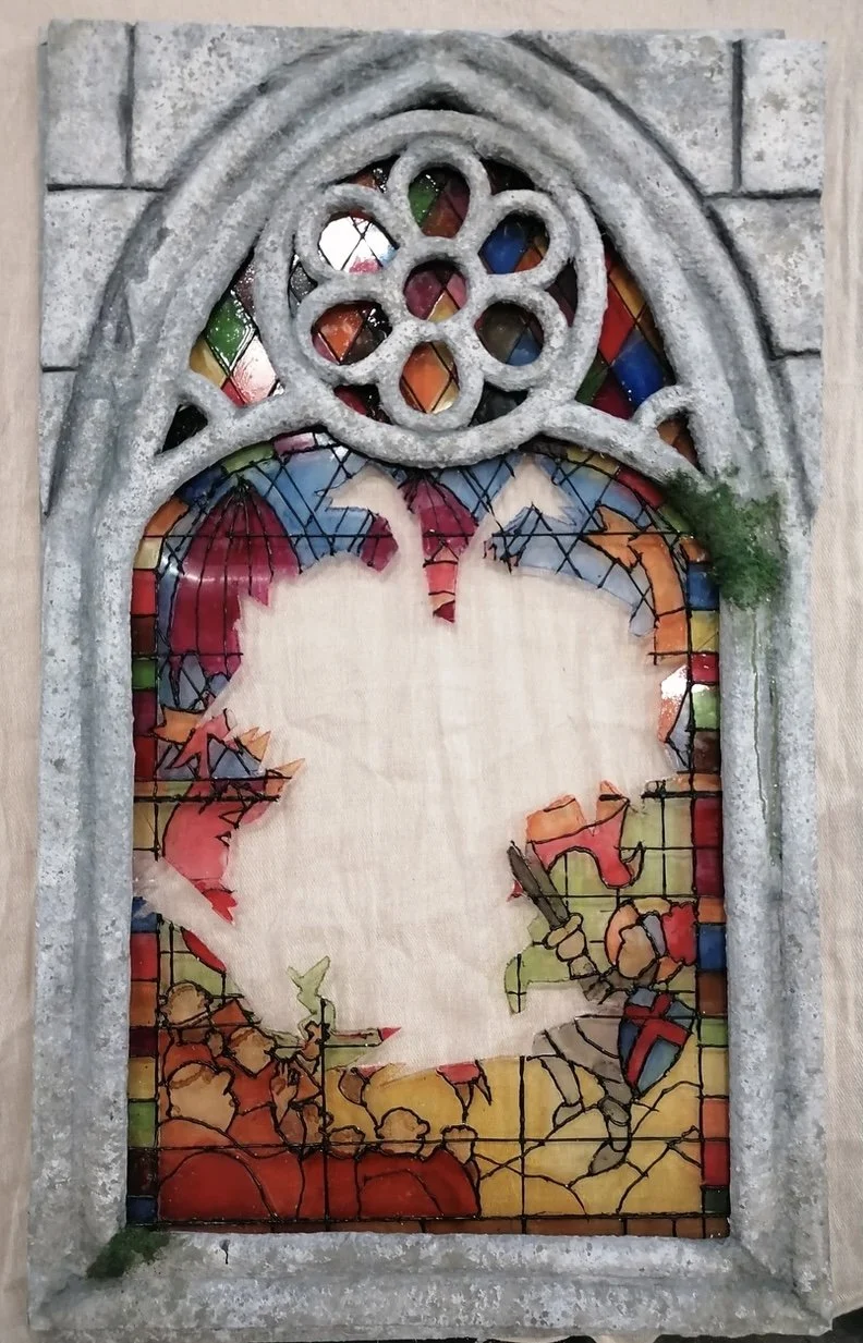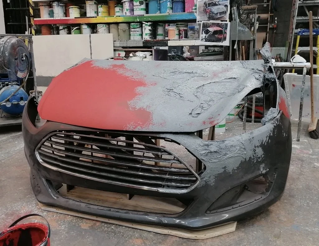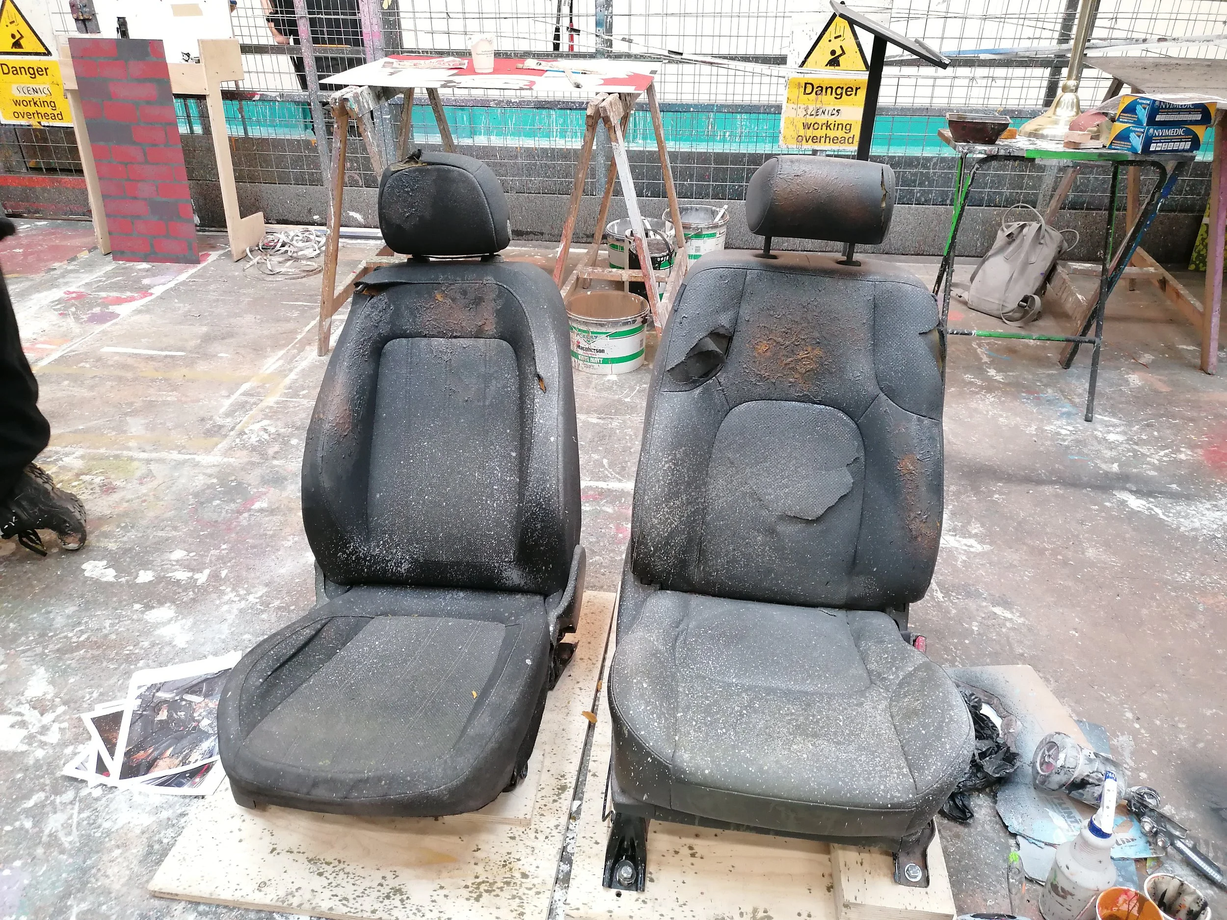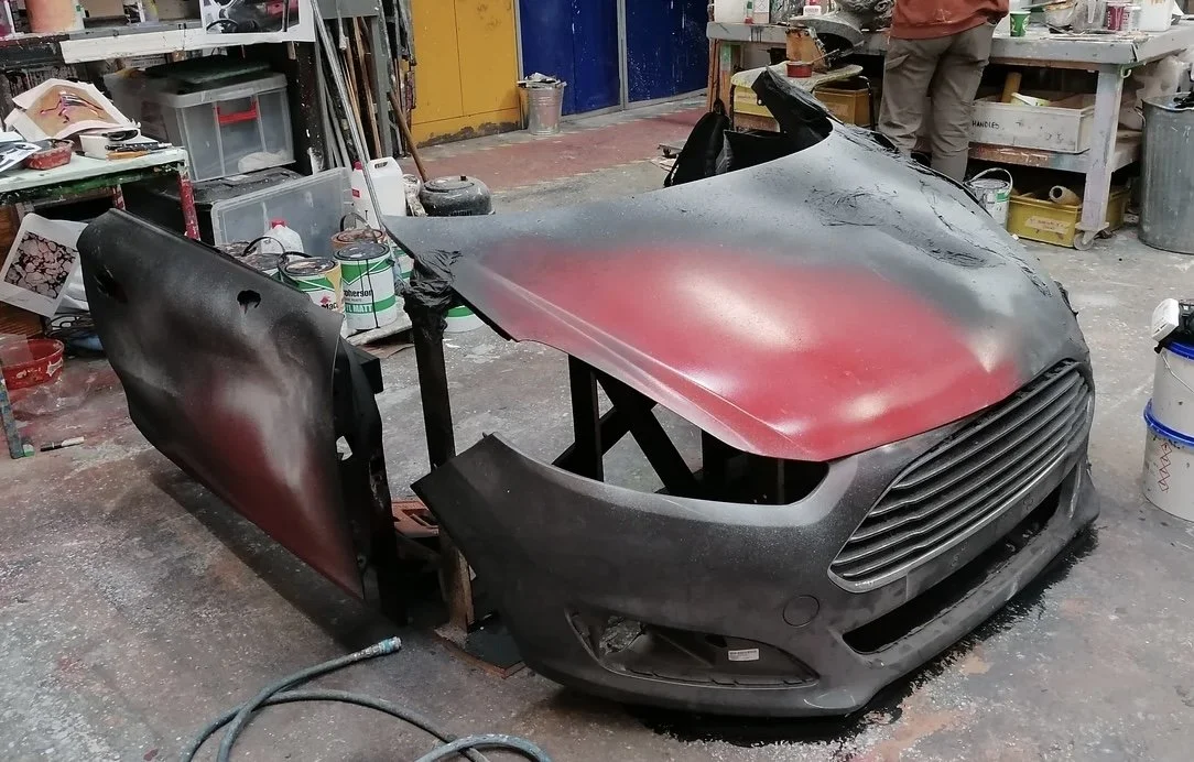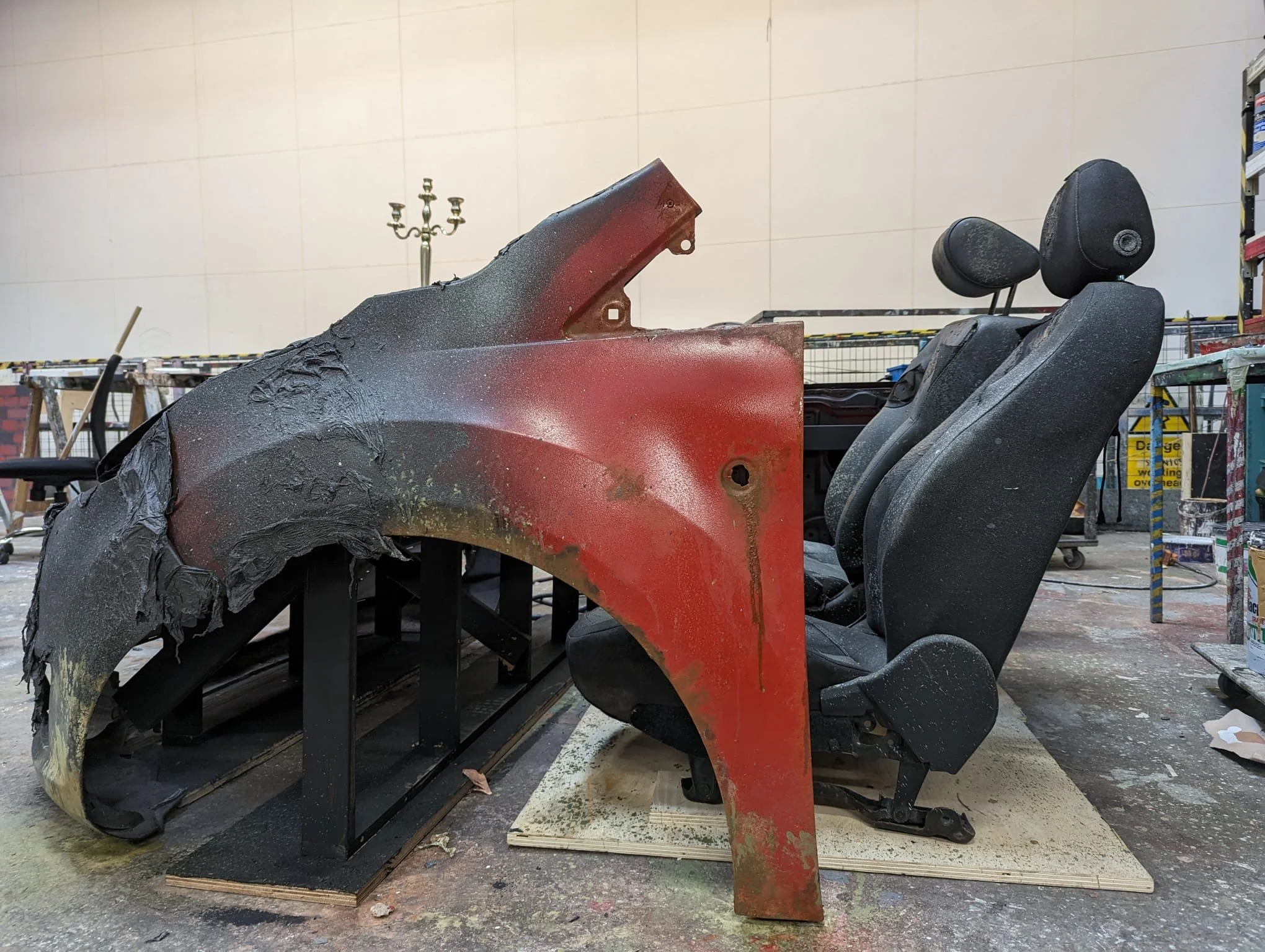 ‘Burnt out’ car made up of scrap pieces matched red with faux rust and melted plastic