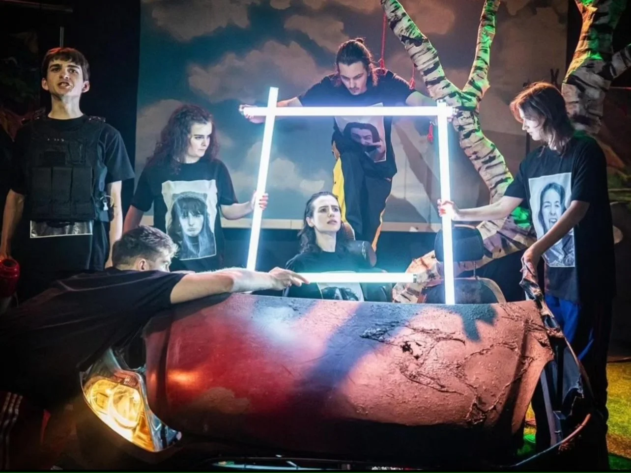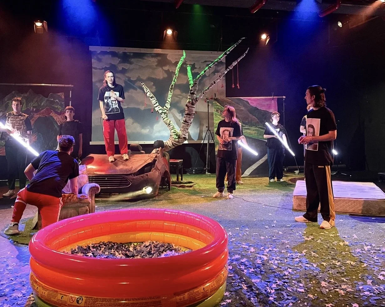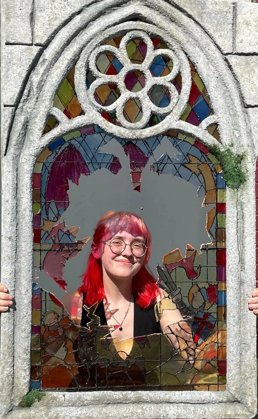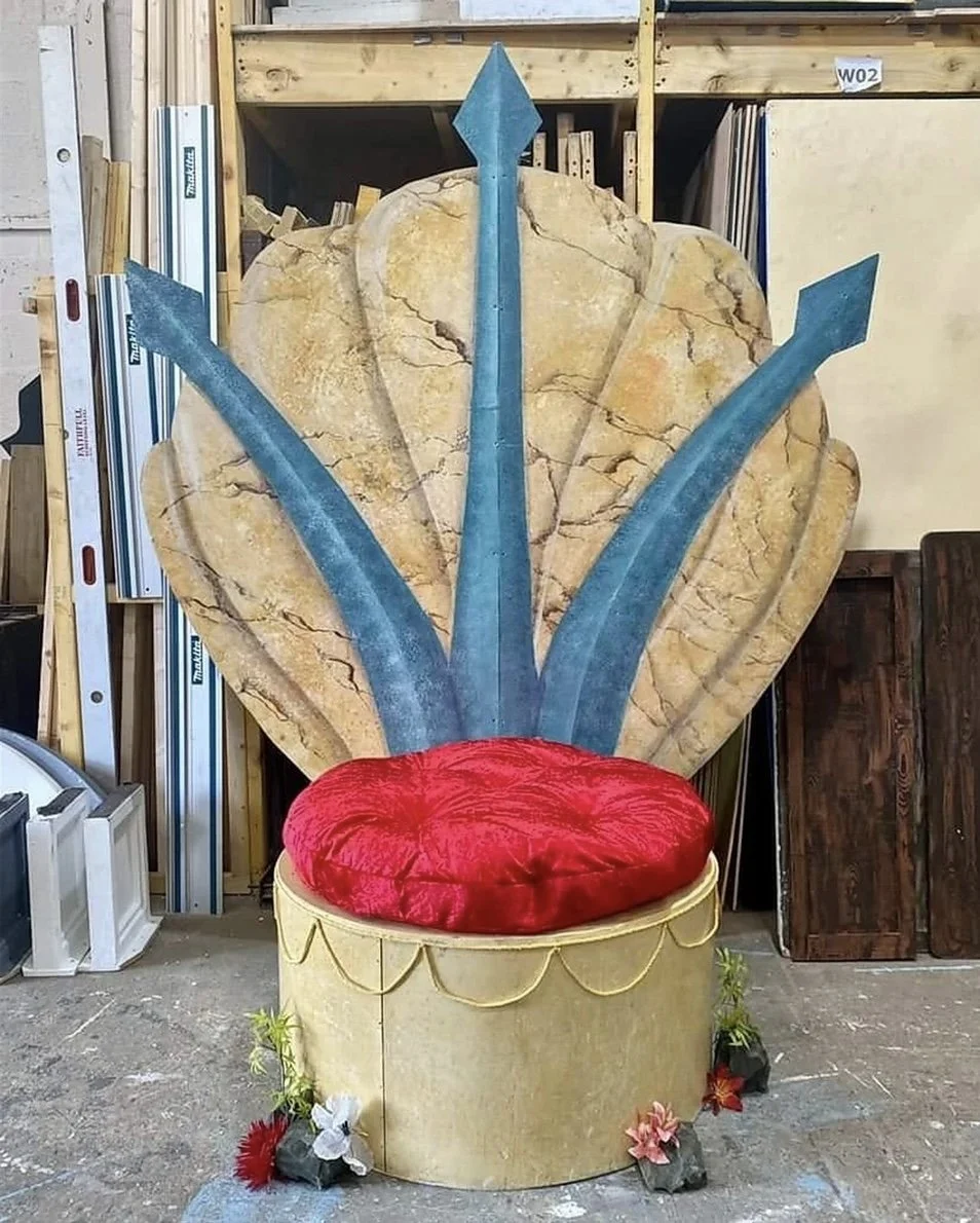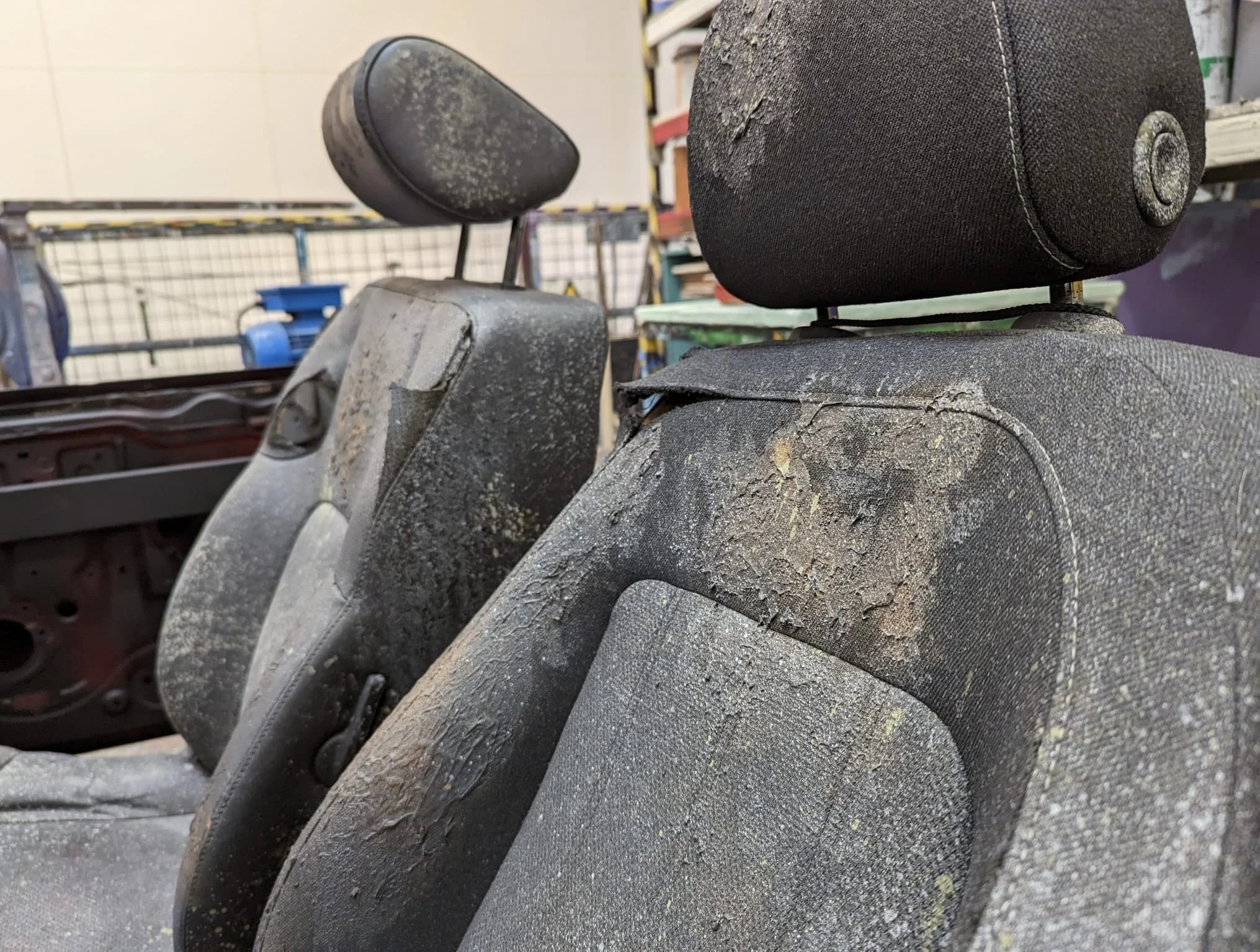 ‘Burnt out’ car made up of scrap pieces matched red with faux rust and melted plastic