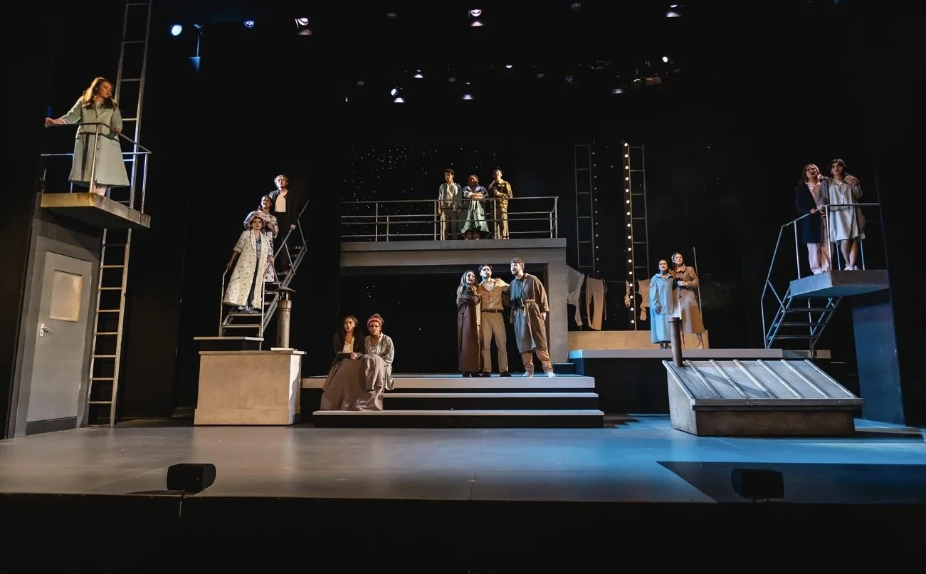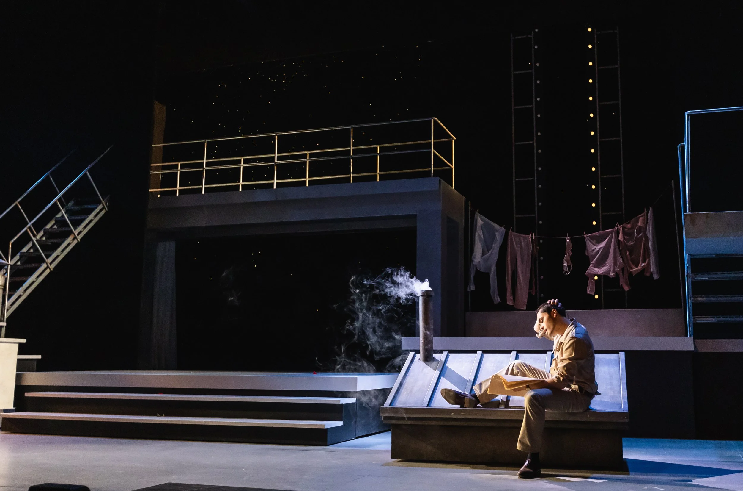Merrily We Roll AlongSign painting, faux rust and rooftop agingDesigner: Ken HarrisonProduction photos: Robert McFadzeanRole: Scenic Artist