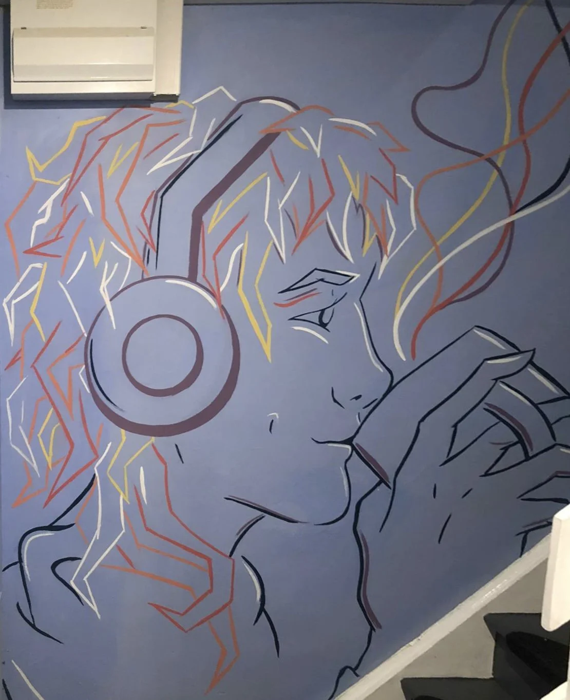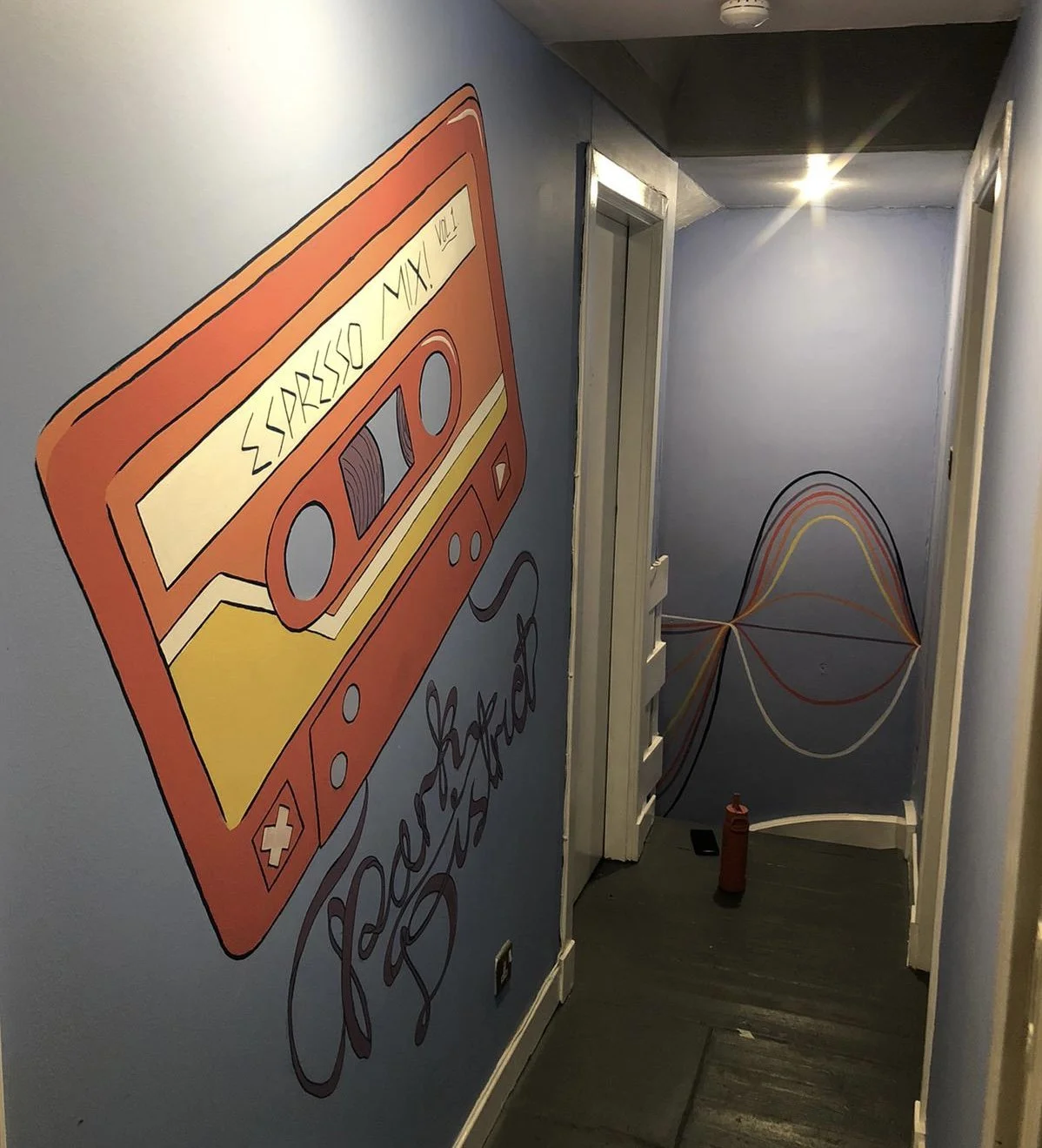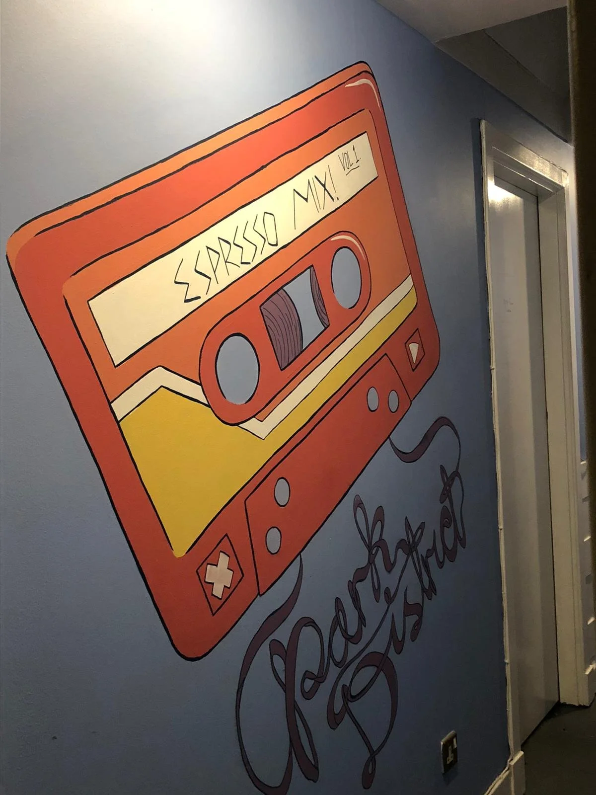 Park District CafeYou can find this mural in the stairwell of Park District Cafe in the Kelvingrove area of Glasgow. It consists of a self portrait, 2 equalisers and a tape designed and painted by myself.